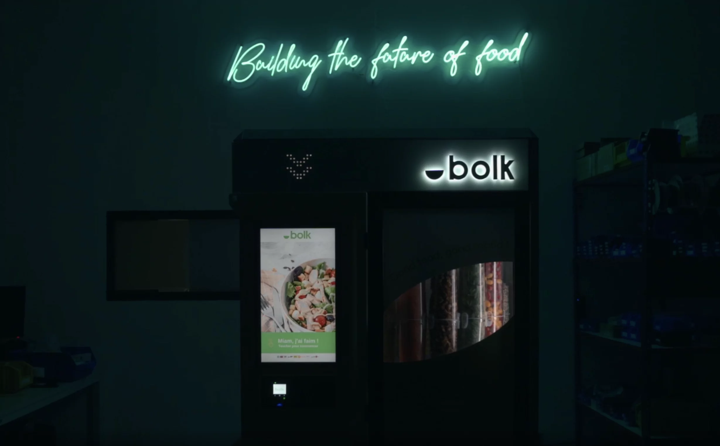 “Manger extra bon extra frais pour le prix d’un ticket resto. Sans bouger du bureau”, la start-up française Bolk se revendique comme la 1ère cantine robotisée. Son principe est de proposer une nouvelle manière de consommer dans les entreprises basées en Ile-de-France des bornes équipées équipées d’un robot qui à travers 24 tubes composés de 24 produits frais, permettent de composer ses propres plats chauds ou froids et les récupérer en 45 secondes chrono. Ces espaces de 2m2 peuvent gérer jusqu’à 100 couverts/jour avec environ 350 combinaisons différentes. Pas de travaux, il suffit d’une prise et du Wifi, le tout clé en main.