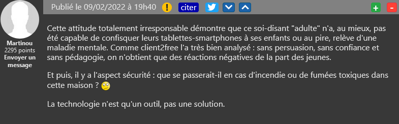 Une solution radicale pour éviter les nuits blanches sur les réseaux sociaux ou les jeux. L’ANFR a en effet été confrontée à une situation assez particulière, où un opérateur de téléphonie mobile l’alertait sur un brouillage affectant toutes les bandes de fréquences mobiles sur la commune de Messanges dans les Landes. La raison ? Un père de famille s’étant équipé d’un brouilleur pour empêcher ses ados de traîner sur leur smartphone la nuit. Une mesure pour le moins démesurée et assez critiquée par nos Freenautes qui suggèrent par exemple de faire preuve de pédagogie et de confiance envers les ados. En sachant que le contrevenant risque de fortes sanctions, cet angle d’attaque aurait pu lui éviter bien des déboires…