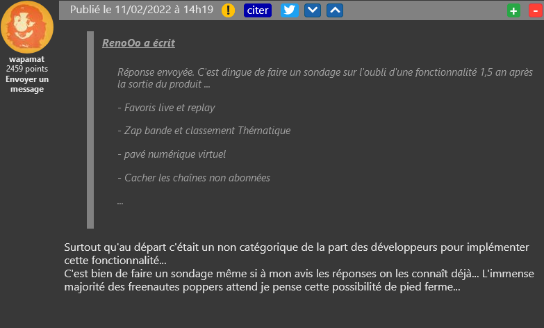 Depuis le lancement d’Oqee sur la Freebox Pop, certains abonnés s’interrogent : pourquoi ne peut-on pas éditer un bouquet de chaînes favorites ? Il s’agit en effet d’une fonctionnalité que les abonnés Freebox Révolution ou Delta par exemple ont pu apprécier sur l’interface maison de leurs box, mais qui n’est pas présente sur Oqee. Une solution est actuellement envisagée par l’opérateur, avec l’idée d’un nouveau système de favoris soumis aux abonnés. Mais certains s’interrogent sur le temps qu’il a fallu à Free pour rectifier le tir, alors que les demandes étaient assez fréquentes en ce sens.