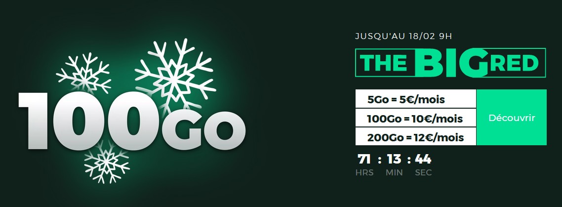Un nouveau Big Red jusqu’au 18 février 2022. La marque low cost de l’opérateur au carré rouge lance en effet trois séries limitées. Elles prennent la forme de forfaits mobiles 5, 100 et 200 Go sans engagement à 5, 10 et 12 euros par mois. Les deux plus gros existent par ailleurs en version 5G à 15 et 17 euros par mois.