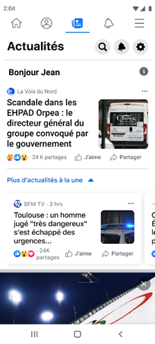 En cliquant sur l’icône de Facebook News, l’utilisateur tombe directement sur les articles à la Une. On peut apercevoir pour chaque article, son titre, une photo ainsi que le media l’ayant publié. Il est également possible sélectionner un thème (sport par exemple) mais aussi de partager un article et de le liker.