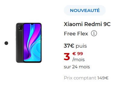 Il s’agit du Xiaomi Redmi 9C proposé à 149 euros au comptant. Dans le cadre de l’offre de location avec option d’achat Free Flex, il faut débourser 37 euros, puis 3,99 euros par mois pendant 24 mois. L’option d’achat s’élève d’ailleurs à 16 euros.