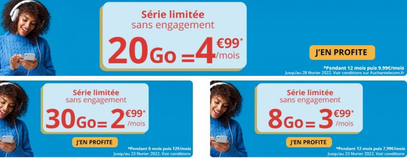 Valables jusqu’au 23 février 2022, des forfaits 8 et 30 Go s’affichent à 3,99 et 2,99 euros par mois. Les tarifs passent à 7,99 euros au bout de 12 mois pour le 8 Go et à 12 euros au bout de 6 mois pour le 30 Go. Disponible jusqu’au 28 février, un troisième forfait à 4,99 euros, puis 9,99 euros au-delà de la première année, intègre 20 Go de data pour l’Internet mobile. La data en roaming depuis l’UE et les DOM s’élève à 7 ou 8 Go selon le forfait et la carte SIM à régler au moment de la commande coûte 10 euros.
