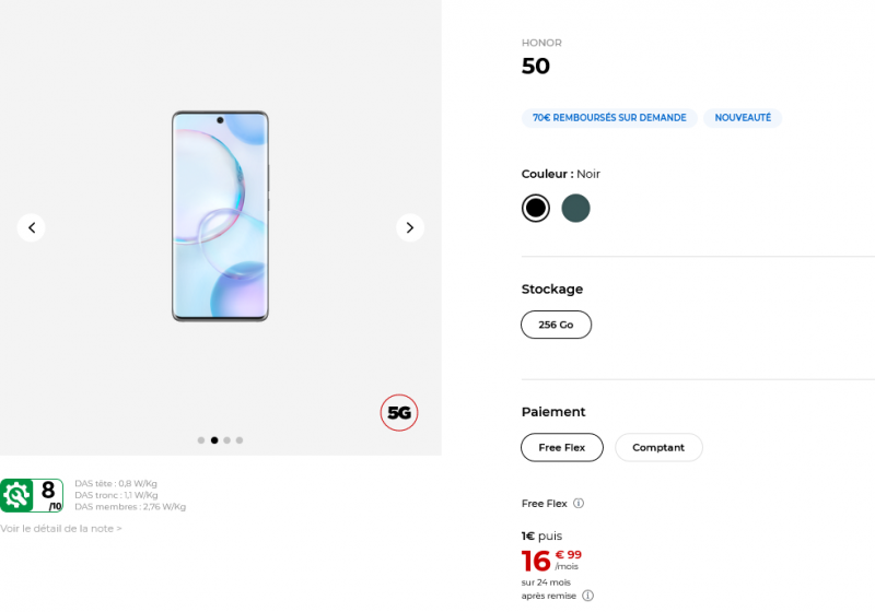Le Honor 50 bénéfice en effet d’une offre de remboursement de 70€, valable pour le modèle 128 Go et celui de 256 Go. A noter cependant que seul le modèle 256 Go est disponible actuellement dans la boutique en ligne. Ce smartphone est proposé à 71€ à la commande, puis 16.99€/mois pendant 24 mois. Après la remise demandée et obtenue, vous pouvez ainsi compter sur une commande à 1€.