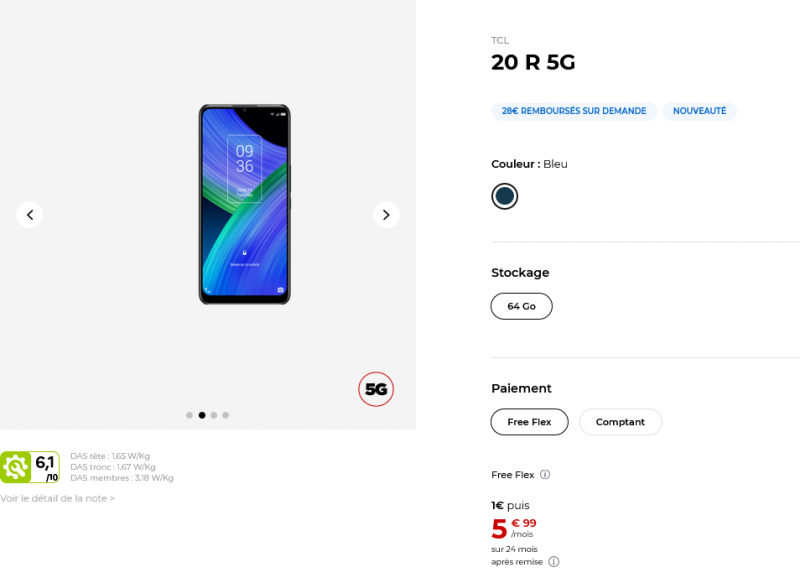 Vient ensuite un smartphone très récemment arrivé dans la boutique de l’opérateur : il s’agit du TCL 20 R 5G, d’une valeur de 199€. En passant par Free Flex, vous devrez ainsi compter sur 29€ à la commande puis 5.99€/mois. Vous pouvez cependant réclamer une offre de remboursement de 28€, faisant passer le montant de la commande à 1€ une fois la remise effectuée.