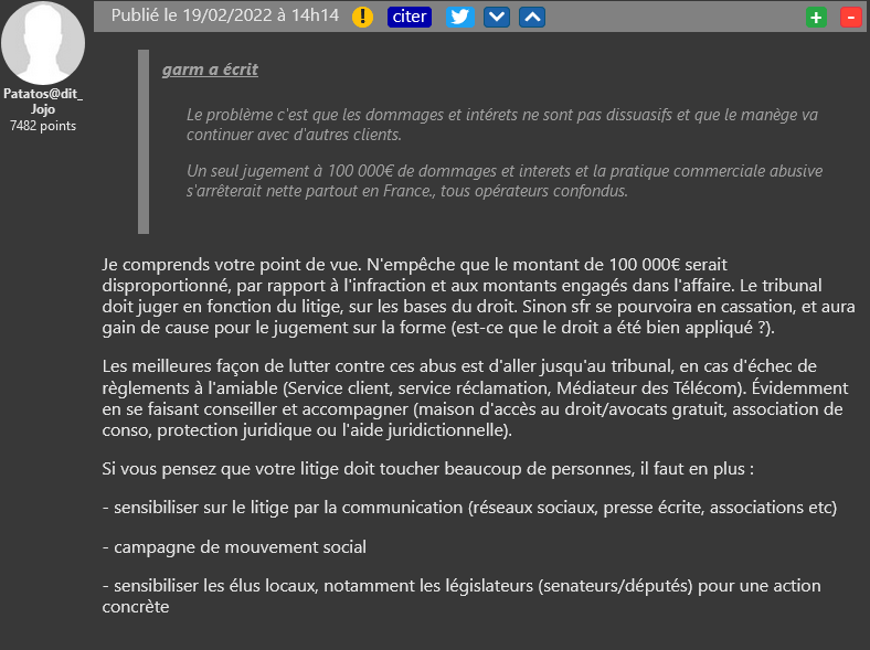 Nous vous relations la semaine dernière l’histoire d’un abonné SFR ayant du faire appel à UFC-Que Choisir, puis à la justice pour obtenir un remboursement de frais appliqués sans raisons valables. Si l’opérateur a été condamné à verser 300€ de dommages et intérêts, la somme est bien sûr loin d’être dissuasive. Pour Patatos (ou Jojo ?), la solution est d’avant tout créer un effet de groupe en sollicitant d’autres abonnés touchés par les même problèmes.
