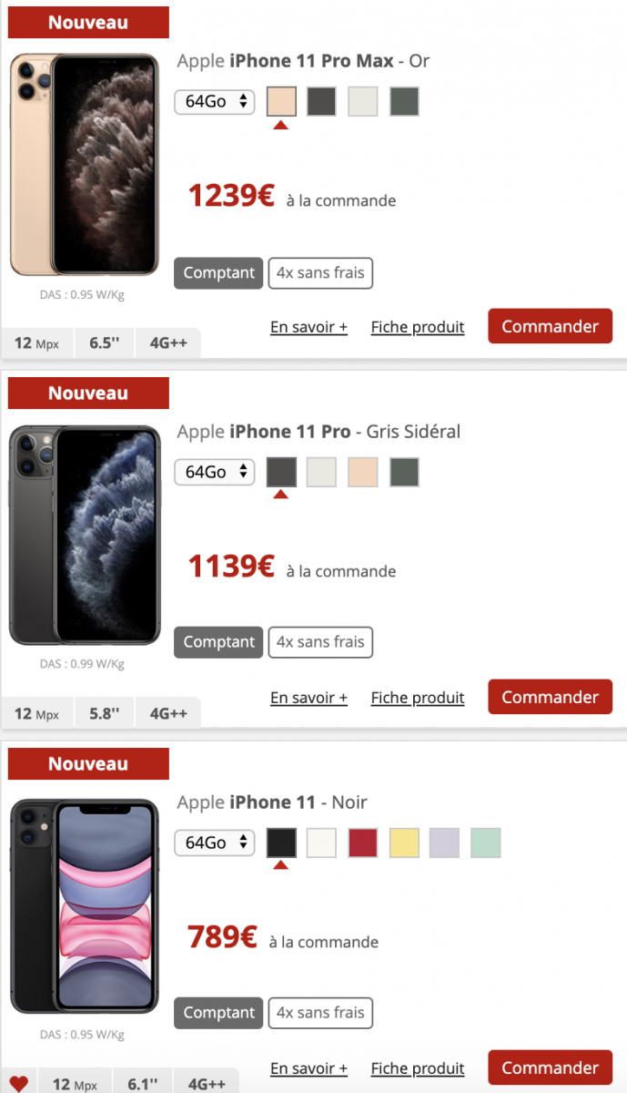 Enfin, l’iPhone Pro Max est affiché en 64Go à 1239€ en paiement comptant ou en 4 fois sans frais : 312€ à la commande puis 3 fois 309€. Le modèle 256Go est proposé à 1419€ et le modèle 512Go à 1649€ (ils sont également disponibles en 4 fois sans frais).