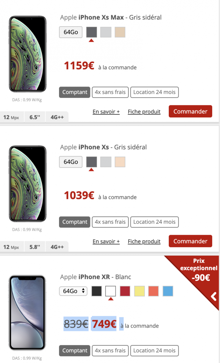 Du côté de l’iPhone XR, “une baisse exceptionnelle” de 90€ est appliquée, le modèle 64 Go passe de 839€ à 749€. Encore trop onéreux par rapport au prix appliqué sur le site d’Apple, où pour la même version il faut compter 709€. Pour 759 euros, on a même le modèle 128 Go. Malgré tout, le prix affiché est désormais inférieur à l’iPhone 11 (789€).