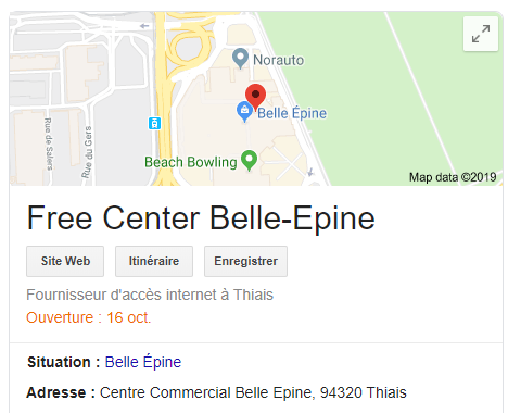 C’est dans le centre commercial “Belle Epine”, l’un des plus fréquentés de France, situé dans la commune de Thiais, dans le département du Val-de-Marne, à proximité d’Orly qu’un nouveau Free Center va prochainement y ouvrir ses portes. Et l’opérateur a maintenant indiqué la date sur sa page Google map. Cette nouvelle boutique dédiée aux offres Freebox et Free Mobile ouvrira donc le 16 octobre prochain.