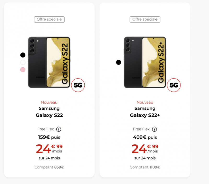 Dans le détail, le Galaxy S22 est affiché en version 128 Go à 859€ en achat comptant, ou à 159€ puis 24 € 99 /mois sur 24 mois via la solution de paiement Free Flex. De son côté, le Galaxy S22+ est proposé à 1109 €, ou à 409€ puis 24 €99/mois sur 24 mois. Enfin, pour acquérir Galaxy S22 Ultra, il faudra débourser 1259€ en achat comptant ou 559€ puis 24 € 99/mois sur 24 mois via Free Flex.