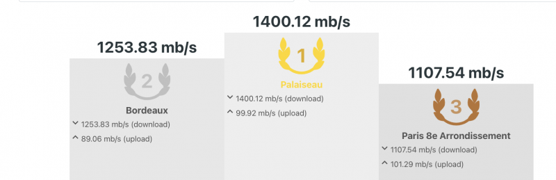 Pour rappel, Univers Freebox vous propose la rubrique “records”. Celle-ci vous permet de découvrir les meilleurs débits réalisés par les utilisateurs de l’application RNC Mobile, sur toute la France. Vous pouvez également retrouver les records dans chaque département ou région. A chaque fois, il vous est indiqué le débit descendants et montants de ces records, ainsi que bien sûr les villes dans lesquelles ils ont été mesurés.