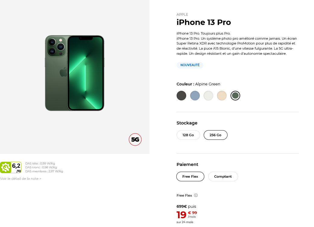 Pour les abonnés étant en recherche de performances et prêt à mettre la main au portefeuille, l’iPhone 13 Pro est également disponible dans ce coloris vert. Pour la version 128 Go, il faudra compter 1159€, ou 579 à la commande puis 19.99€/mois via Free Flex. Si vous voulez davantage de stockage, la facture grimpe en passant à 1279€ au comptant ou 699€ puis 19.99€/mois.