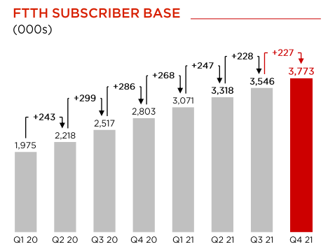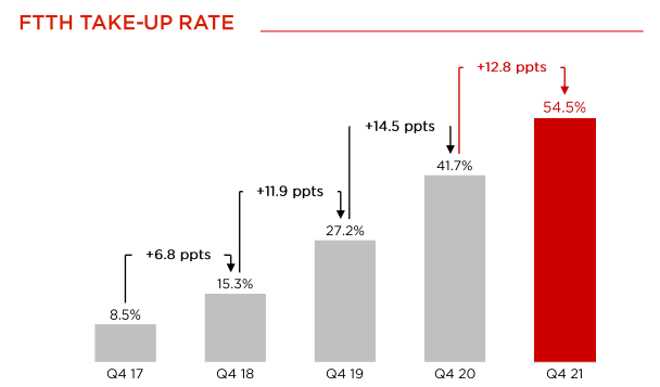Il faut dire que Free a encore beaucoup recruté sur ce segment en 2021 avec 970 000 nouveaux abonnés (migrations comprises) pour atteindre un total de 3,77 millions d’abonnés fibre. Un chiffre qui devrait continuer à croitre d’autant durant cette année 2022 puisque Free reste sur un rythme trimestriel d’un peu moins de 250 000 nouveaux abonnés.
