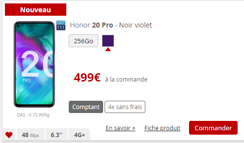 Le Honor 20 pro passe de 599 euros à 499 euros, soit 100 euros de moins La baisse est également appliquée sur le paiement en plusieurs fois sans frais : 127 euros à la commande puis 124 euros durant 3 mois. Vous pouvez retrouver le test du Honor 20 Pro réalisé par Univers Freebox.
