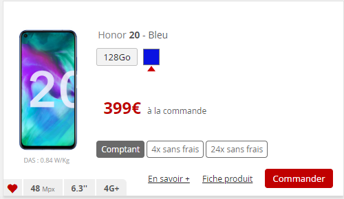 Le Honor 20 passe de 499 euros à 399 euros, soit 100 euros de moins. La baisse est également appliquée sur le paiement en plusieurs fois sans frais : 102 euros à la commande puis 99 euros durant 3 mois. Ou en 24 fois : 207 euros à la commande puis 8 euros durant 24 mois. Vous pouvez retrouver le test du Honor 20 réalisé par Univers Freebox.