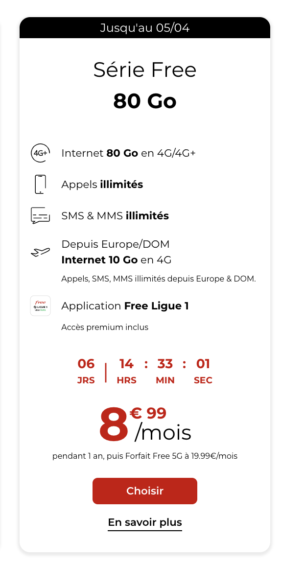 Juqu’au 5 avril prochain, l’opérateur prolonge sa formule Série Free 80 Go à 8,99€/mois pendant 1 an. Mais avec un peu plus de data à utiliser à l’étranger.