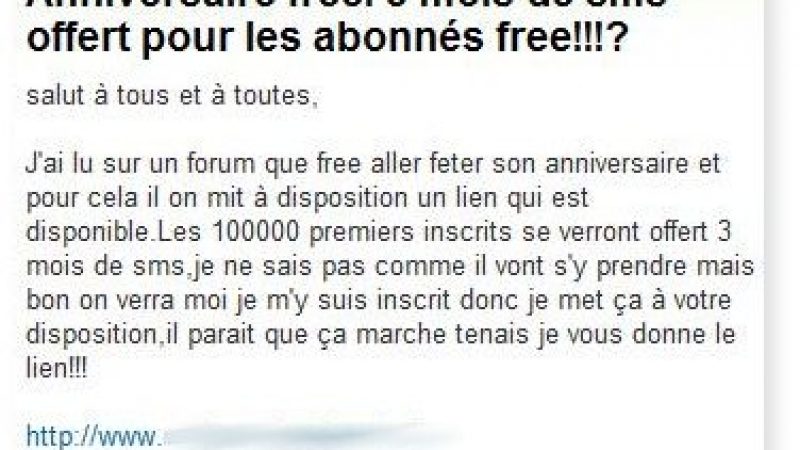 Depuis plusieurs heures, un message – avec un lien dirigeant vers un faux site Free.fr – est posté sur différents forums de discussion. Ce message prétend que, pour fêter son anniversaire, Free offrirait 3 mois de SMS gratuits aux abonnés dans la limite des 100 000 premières inscriptions.