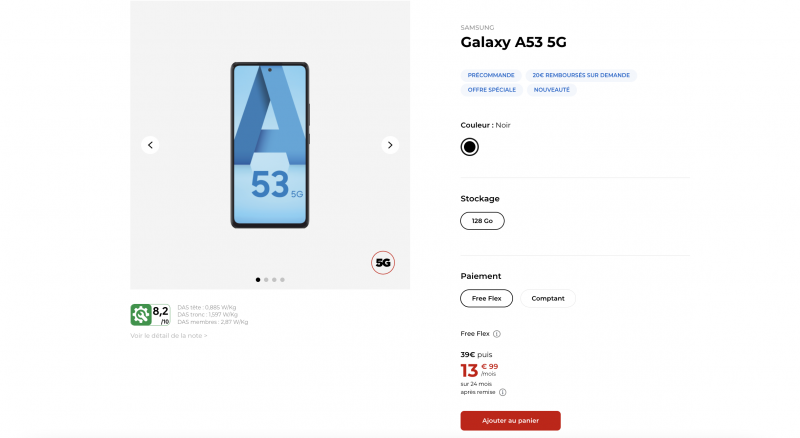 Disponible en précommande chez Free Mobile depuis le 19 mars, le nouveau Samsung Galaxy A53 bénéficie d’une offre de remboursement sur demande de 20€ et d’une baisse de prix via Free Flex.