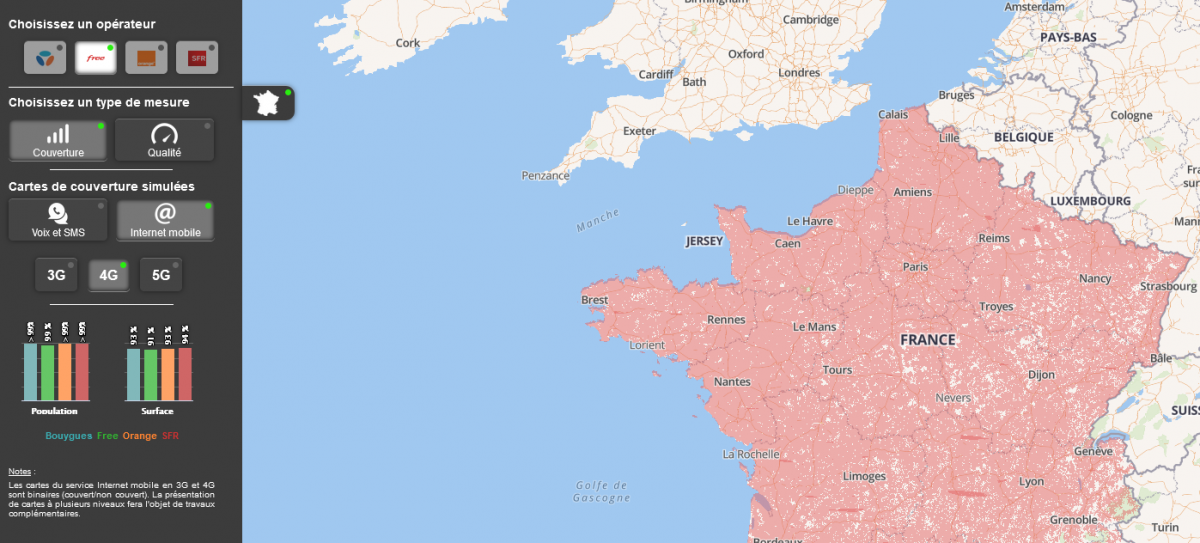Couverture, débits, qualité, tout y est. Le régulateur des télécoms propose un outil bien pratique regroupant toutes ces informations et a récemment mis les données affichées à jour pour donner un aperçu de l’état du réseau mobile à la fin de l’année 2021. Selon les indicateurs de l’Arcep, tous les opérateurs proposaient ainsi une couverture de la population en 4G supérieure à 99%. Les écarts les plus notables concernent surtout la couverture du territoire, où SFR est présent sur 94%, Orange et Bouygues Telecom sur 93% et enfin Free couvre 91% de la surface de l’Hexagone en 4G.
