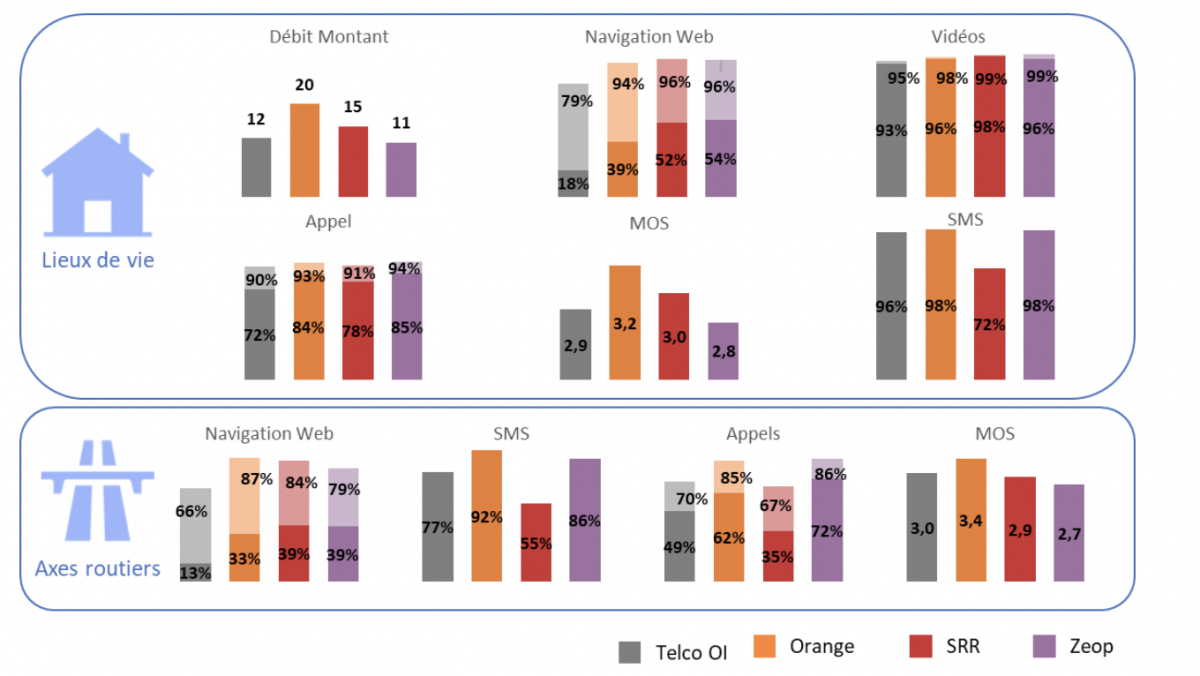 À La Réunion, malgré un taux de succès en baisse pour la voix et les SMS (en particulier pour SFR et Free Réunion (Telco Oi)), les résultats se maintiennent à un niveau élevé (en moyenne, 93% des appels sont passés sans perturbations audibles en lieux de vie). La qualité de service de Zeop qui bénéficie d’un contrat d’itinérance 2G/3G/4G sur le réseau Orange Réunion, s’améliore nettement sur les usages web et streaming pour atteindre des performances comparables à celles d’Orange et SFR sur la plupart des indicateurs. Telco OI, soit Free Mobile reste en retrait sur la data. Gros bémol, les débits descendants à la Réunion et à Mayotte n’ont pas pu être mesurés, du fait de problèmes liés aux serveurs de test.