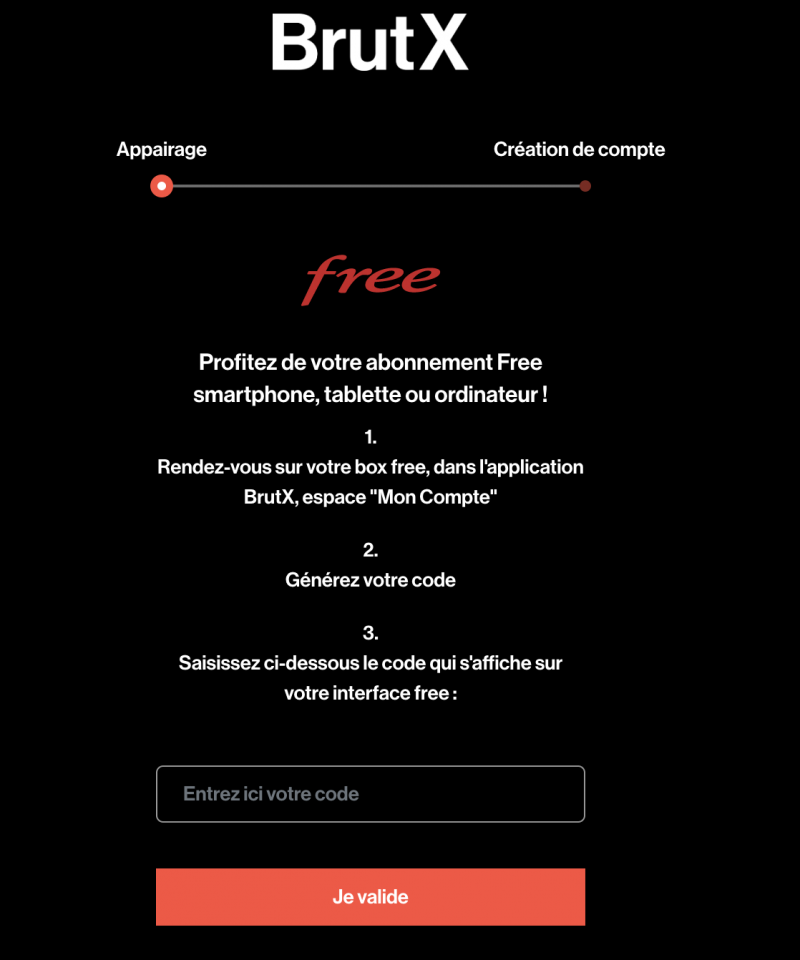 Pour les abonnés Freebox désireux de profiter de cette offre, il faudra suivre un parcours précis, détaillé par la plateforme. La souscription se fera sur navigateur après appairage de votre Freebox. Pour ce faire, rendez-vous dans l’application BrutX sur votre Freebox, espace “Mon Compte”, et générez votre code. Il suffira ensuite de l’entrer dans la page de souscription sur le site de BrutX en cliquant sur l’icône Free lors de la première étape. Restera ensuite à choisir l’abonnement d’un an à 24€.