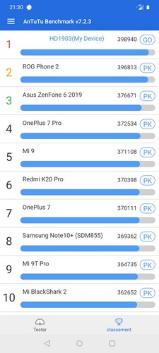 Nous avons passé le OnePlus 7T dans AnTuTu et Disk Speed. AnTuTu ne peut être plus clair, avec notre smartphone qui se retrouve à…. la première place du classement. Disk Speed indique de son côté 0,98 Go/s en lecture et 215 Mo/s en écriture pour la mémoire interne.