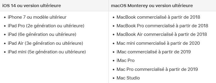 Sans surprise, l’iPhone, l’iPad et le Mac permettent de diffuser via Airplay, mais dans le cas d’Oqee, étant donné qu’il n’existe qu’une version mobile à l’heure actuelle, nous nous intéresserons aux manipulations permettant l’utilisation sur iPhone et iPad. Quant aux appareils capables de recevoir vos contenus, la se résume en trois types d’appareils : l’Apple TV, les Mac, mais aussi de nombreux téléviseurs connectés. Apple fournit une liste des conditions minimum requises pour accéder à Airplay, que vous pouvez retrouver dans le tableau ci dessous.