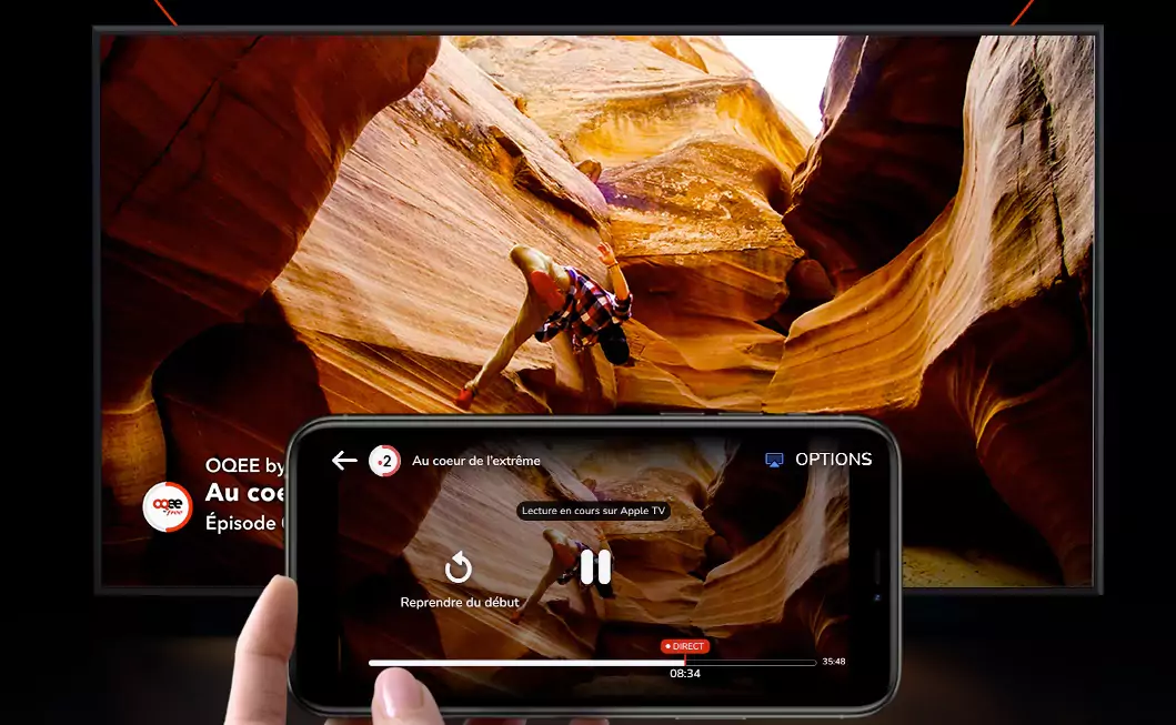 Dans sa dernière mise à jour majeure, Oqee sur iOS a intégré une compatibilité avec Airplay. Pour rappel, ce standard est utilisé par Apple pour permettre à ses appareils de diffuser des contenus directement sur divers terminaux compatibles. Cette compatibilité peut se séparer en deux types d’appareils : ceux capables de recevoir des contenus vidéos via AirPlay et ceux capable d’émettre des contenus.