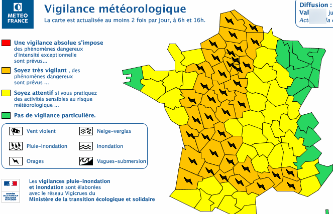 Attention orages ! Si vous habitez dans l’Aisne (02), Aveyron (12), Bouches-du-Rhône (13), Corrèze (19), Eure (27), Gard (30), Hérault (34), Lot (46), Lot-et-Garonne (47), Nord (59), Oise (60), Pas-de-Calais (62), Paris et petite couronne (75-92-93-94), Seine-Maritime (76), Seine-et-Marne (77), Yvelines (78), Somme (80), Tarn (81), Tarn-et-Garonne (82), Vaucluse (84), Essonne (91), Val-d’Oise (95), en Charente (16), Charente-Maritime (17), Cher (18), Dordogne (24), Eure-et-Loir (28), Gironde (33), Indre (36), Indre-et-Loire (37), Landes (40), Loir-et-Cher (41), Loiret (45), Maine-et-Loire (49), Orne (61), Sarthe (72), Deux-Sèvres (79), Vienne (86) et Haute-Vienne (87). pensez à mettre vos Freebox à l’abri des intempéries. Ces 42 départements ont été placés en alerte orange en raison des violents orages prévus, selon la carte de vigilance de Météo-France. L’alerte a été diffusée cet matin et est valable jusqu’à demain mardi 15 octobre à 6h00