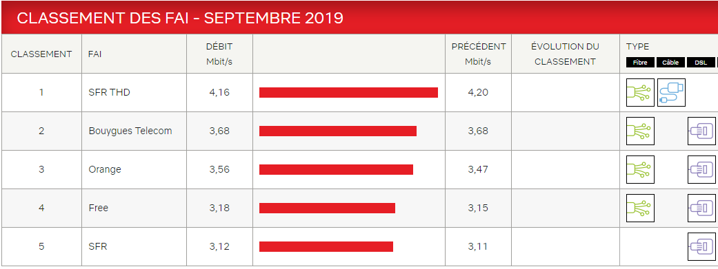 Concrètement, au cours du mois de septembre SFR “THD” (anciennement Numéricable) conserve sa place de numéro un avec un débit moyen de 4,16 Mbits/s en légère baisse par rapport à août (4,20 Mbits/s). En deuxième position, Bouygues Télécom, affiche 3,68 Mbits/s, le même score que le mois dernier. A la 3ème place on trouve Orange avec 3,56Mbits/s, en légère hausse sur 1 mois ( + 0,09 Mbits/s), suivi par Free avec 3,18 Mbits/s contre 3,15 Mbits/s le mois dernier. Il s’éloigne ainsi de SFR, dernier du classement, qui affiche un débit moyen de 3,12 Mbits/s (contre 3,11 Mbits/s en août).