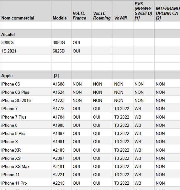 Sur ce document, vous pourrez ainsi voir si votre smartphone est compatible avec la norme qui vous intéresse mais également si sa compatibilité est prévue, avec parfois une échéance plus ou moins précise allant du mois de déploiement au trimestre. A noter par ailleurs, si vous voyez un “non” s’afficher sur la case que vous recherchez, cela signifie que la fonctionnalité ne sera jamais disponible et si vous voyez une case vide, cela signifie que l’opérateur de Xavier Niel ne possède pas encore l’information.