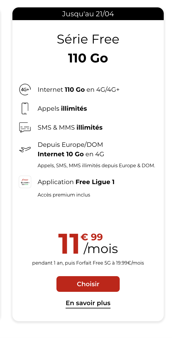 Ne pas savoir sur quel pied danser… Quelques heures seulement après avoir prolongé et modifié très légèrement son offre Série Free 90 Go à 11,99€/mois pendant 1 an, Free Mobile change de fusil d’épaule ce 13 avril, et décide de revoir sa formule. Jusqu’au 21 avril, l’opérateur inclut désormais dans son forfait 110 Go de data en France métropolitaine ainsi que 10 Go en roaming, toujours au même prix. De quoi susciter une éventuelle colère chez les consommateurs ayant souscrit à cette offre ce matin, lesquels se retrouvent avec une enveloppe de données moins conséquente.