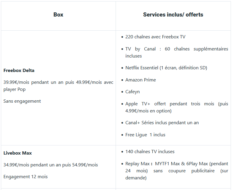 Il s’agit ici des offres telles qu’elles sont proposées le mardi 19 avril. Le choix étant ici de présenter les offres standard, sans ajout potentiel (fibre XGS-Pon pour la box SFR, player différent pour la Freebox Delta etc.). Pour ce tableau comparatif, nous ne prenons en compte que les services proposés lors de l’abonnement, qu’ils soient inclus indéfiniment ou offerts pendant une période pré-déterminée. Certains services peuvent également être proposés en option une fois l’offre souscrite.