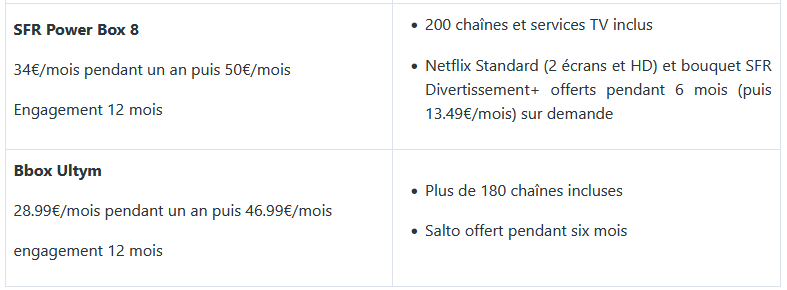 Bouygues Telecom propose pour sa part l’offre premium la moins chère mais inclut tout de même un abonnement à une plateforme de SVOD pendant les six premiers mois. Une proposition qui pourra intéresser ceux ayant envie d’une offre très performante (notamment en WiFi) avec un petit bonus pour occuper leur soirée devant la télévision, à condition d’être séduit bien évidemment par le catalogue de Salto.
