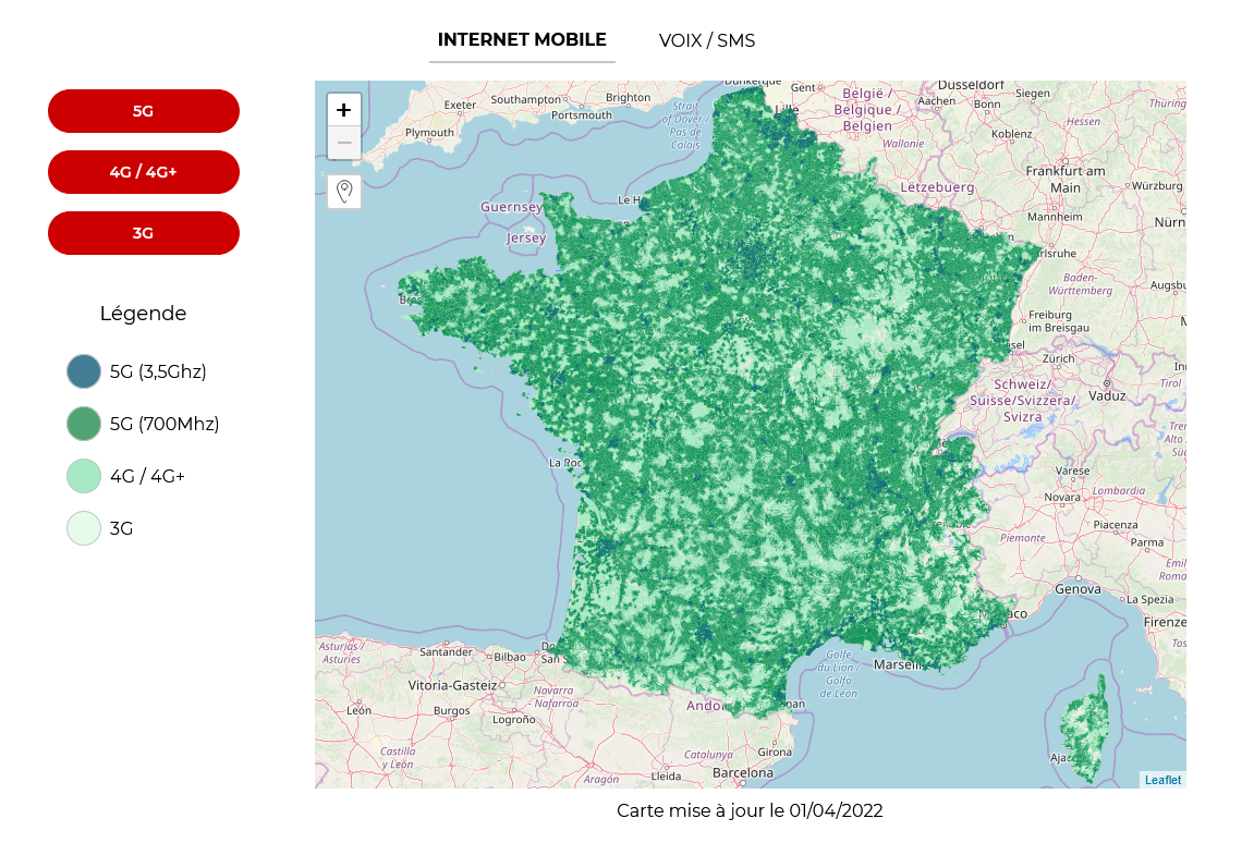Pour rappel, cette carte permet de connaître précisément la couverture 3G et 4G de l’opérateur mais aussi la disponibilité de la 5G près de chez vous. Avec notamment une distinction faite entre les deux fréquences utilisées pour cette nouvelle génération de téléphonie mobile : la 3.5 GHz, bande “coeur” de la 5G permettant des débits plus élevés est indiquée en bleu et la 700 MHz qui elle vise à une meilleure couverture et une pénétration des murs plus importante, en vert foncé. La carte est interactive et permet d’afficher la technologie de votre choix. Vous pouvez également rechercher directement votre adresse grâce à une barre au dessus de la carte.