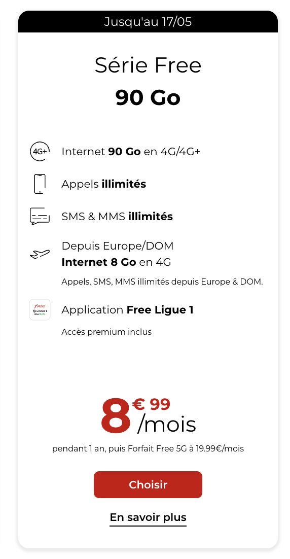 Face aux offres renouvelées toutes les semaines de Red by SFR, B&You et Sosh, Free Mobile prolonge aujourd’hui jusqu’au 17 mai son offre Série Free 90 Go en France métropolitaine à 8,99€/mois pendant 1 an. Seul changement à noter, la data incluse depuis l’Europe et les DOM passe à 8 Go contre 10 Go précédemment. Au-delà de la première année, les abonnés basculeront automatiquement sur le forfait Free 5G 210 Go à 19.99€/mois. Le service Free Ligue 1 en accès premium est également inclus.