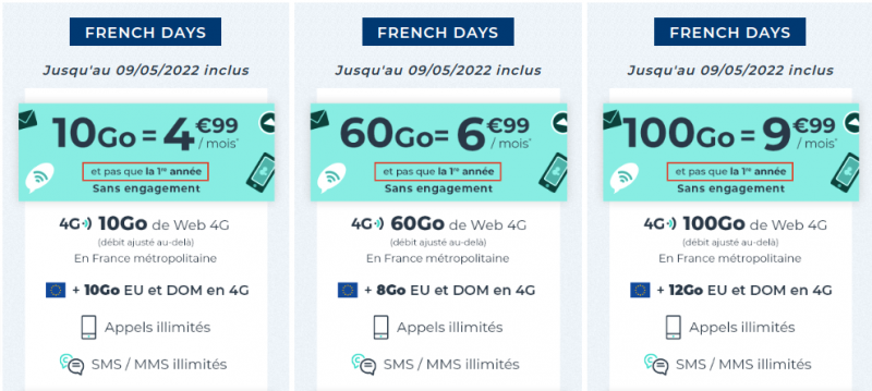 Jusqu’au 9 mai 2022, Cdiscount Mobile commercialise trois forfaits 4G sans engagement à petit prix dans le cadre des “French Days”. Des forfaits 10, 60 et 100 Go (débits ajustés au-delà) reviennent ainsi à 4,99, 6,99 et 9,99 euros par mois sans limite de durée dans le temps. Ils intègrent les appels, SMS et MMS illimités, ainsi qu’une connexion internet allant de 8 Go à 12 Go pour le roaming depuis l’Europe et les DOM selon le forfait sélectionné.