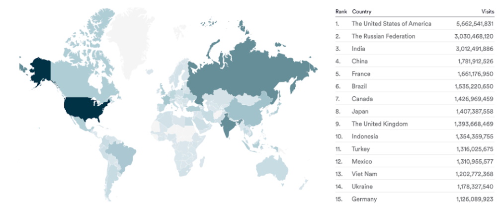 MUSO a classé les pays dont les habitants se rendent le plus sur les sites pirates. Si le nombre d’habitants peut beaucoup jouer sur ce classement, il ne fait pas tout. Les États-Unis sont en effet les premiers avec plus de 5.66 milliards de visites sur les trois premiers mois de l’année, concentrant à lui seul 10% du trafic. Viennent ensuite la Russie et l’Inde, avec environ 3 milliards de visites sur le trimestre puis la Chine avec 1.7 milliards.