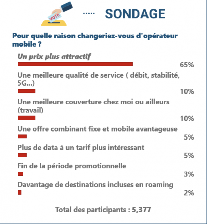 L’ex-président de l’Arcep n’a pas été écouté. En 2017 Sébastien Soriano l’estimait, les consommateurs choisissaient alors en majorité leur opérateur mobile par rapport au prix. Sa volonté que ces derniers fassent à l’avenir leur choix en fonction de la couverture n’a visiblement pas été exaucé. Près de 5 ans plus tard, les résultats de notre sondage lancé le 14 mars sont sans appel. Sur les 5377 votants ayant répondu à la question “pour quelle raison changeriez-vous d’opérateur mobile”, 65% d’entre eux ont répondu “un prix plus attractif”. Compréhensible dans le contexte actuel mais étrange lorsque l’on sait que les prix pratiqués dans l’Hexagone font partie des plus bas en Europe, et qu’ils sont similaires chez les différents opérateurs. Il faut toutefois avouer que la concurrence féroce sur ce marché animé par des promotions hebdomadaires souvent agressives en matière de ratio prix/data mais aussi par des augmentations de prix décriées par exemple chez Red by SFR et Bouygues Telecom, rendent les Français très volatiles. Les offres sans engagement le permettent également.