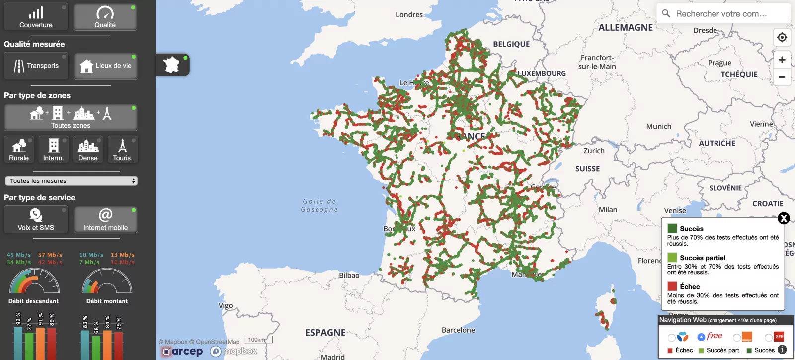 Autre nouveauté, le régulateur propose désormais sur son site une représentation cartographique des résultats en zone d’habitation et ce en plus de l’open data. Il est également possible de visualiser les résultats selon sa propre expérience : en zone rurale, en zone dense, à l’intérieur des bâtiments, en voiture etc.