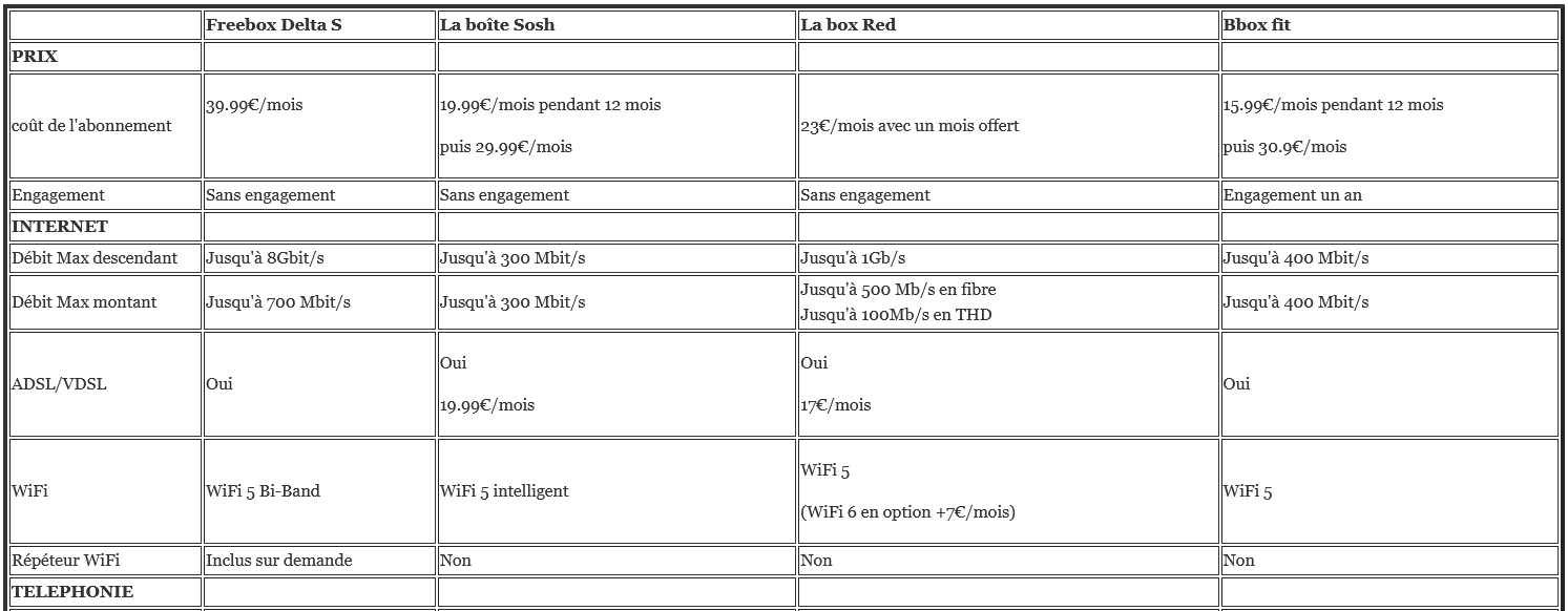 Dans ce comparatif, on peut noter que Free se détache énormément de ses concurrents en proposant une offre double-play haut de gamme. En effet, il s’agit tout simplement de la Freebox Delta sans aucun de ses services audiovisuels. Elle propose ainsi des débits largement supérieurs à ses concurrentes et un Server aux capacités plus développées, mais est fatalement plus chère. On peut cependant noter qu’il est possible de s’abonner chez Free à une autre Freebox et de choisir de ne pas utiliser les services TV. Pour les abonnés Freebox Delta, Révolution et mini 4K, la suppression de l’option TV peut même alléger la facture de 2.99€/mois. Il est également possible de souscrire à la Freebox Pop sans player, mais cela n’impactera pas votre abonnement.