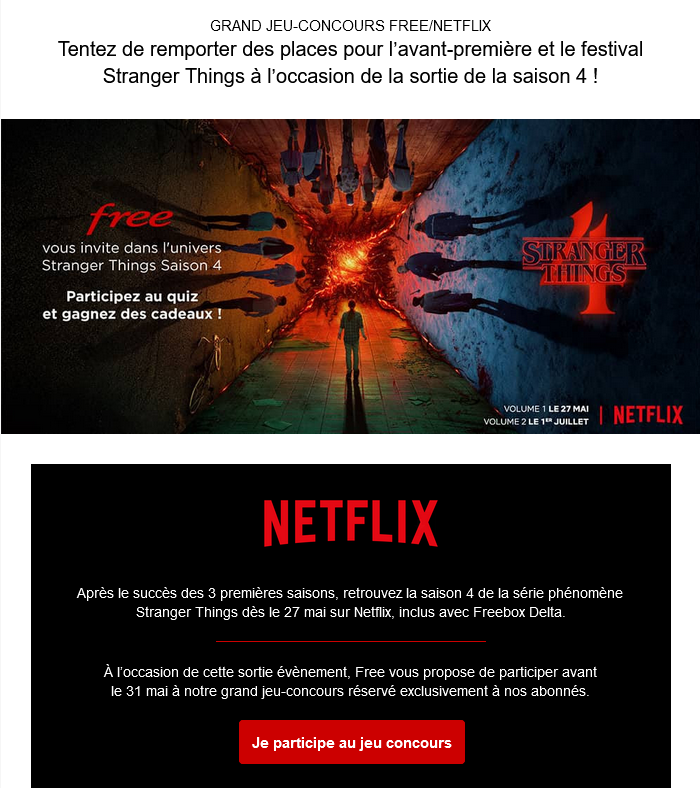C’est un petit peu l’événement Netflix de ce mois de mai, l’arrivée de la saison 4 de Stranger Things sera l’occasion d’une grande avant-première et même d’un festival dédié. Free propose dans un mail envoyé à certains abonnés de participer à un jeu concours en lien avec ces évènements, dont le gagnant pourra remporter des places pour ces deux évènements mais également de nombreux cadeaux en lien avec cette série.