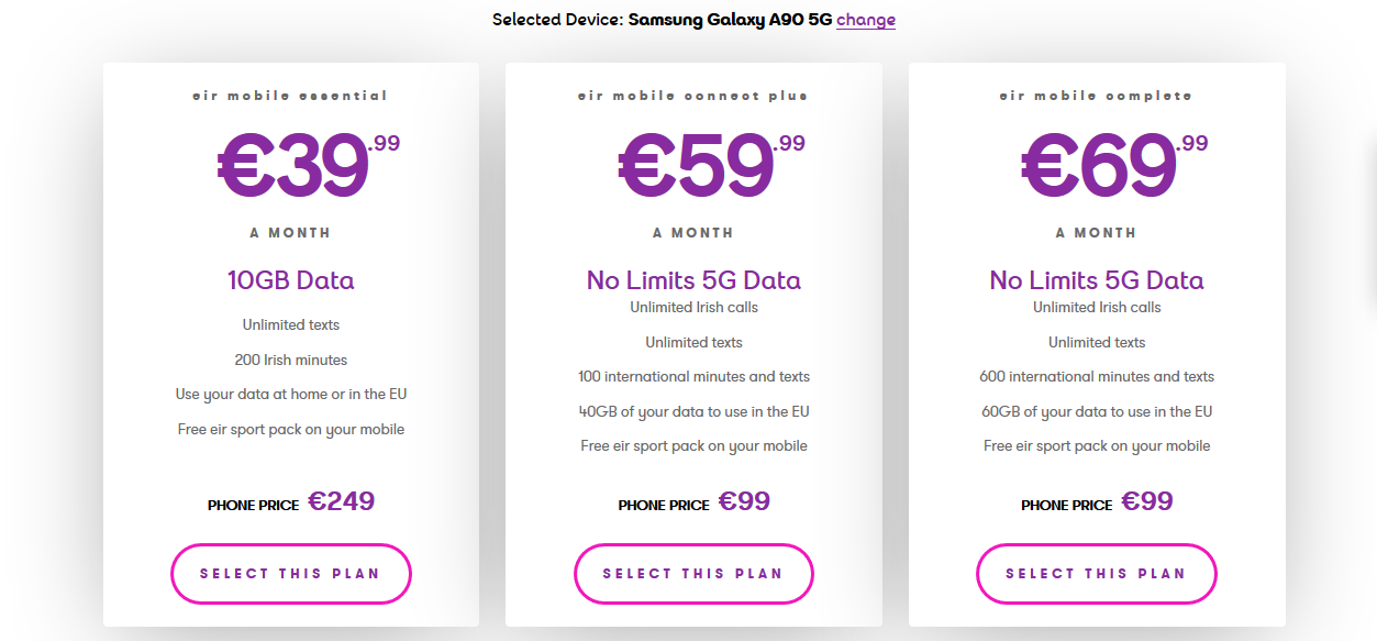Eir a egalement annoncé que son réseau 5G etait disponible dès maintenant pour l’ensemble de ses clients “Bill Pay” et que plusieurs mobiles compatibles 5G tels que les Huawei mate 20X 5G, Samsung A90 5G, Samsung S10 5G et le Samsung Note 10+ 5G étaient disponibles dans sa boutique à partir de 99€ avec des forfaits allant de 39€99 à 69€99.