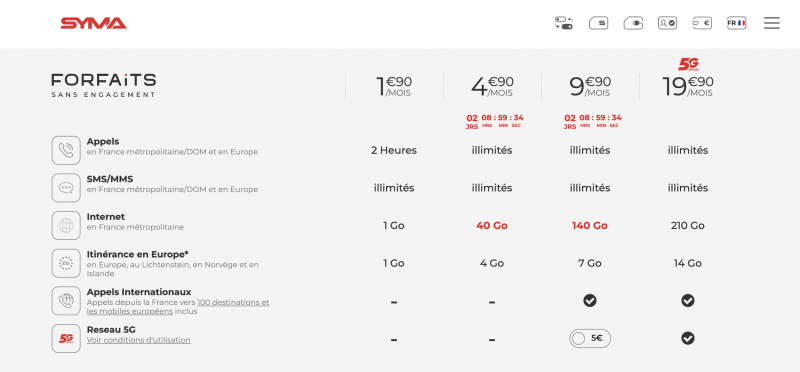 Syma Mobile propose des forfaits grand public allant d’1 Go à 1,90€/mois à 210 Go au prix de 19,90€/mois. Pour l’heure, ses abonnés utilisent encore le réseau d’Orange et de SFR. Seul ce dernier sera proposé à l’avenir.