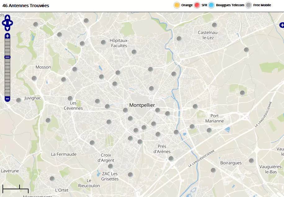 Free a implanté 39 antennes mobiles 4G dans la ville de Montpellier (antennes non-actives incluses).