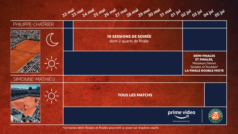 Dans le détail, la plateforme SVoD d’Amazon détient les droits exclusifs de l’intégralité des matchs des 10 sessions de soirée qui débutent le 23 mai à 21h00 à partir du premier lundi du tableau principal, ainsi que tous les matchs du court Simonne-Mathieu qui débutent le 22 mai 2022 et les droits exclusifs partagés pour la retransmission des demi-finales et des finales simples et doubles Messieurs et simples et doubles Dames, ainsi que pour la finale double mixte. Les matches seront également disponibles en replay dans les 15 minutes suivant la fin de la rencontre sur la page dédiée au tournoi. Vous pourrez également y retrouver les meilleurs moments.