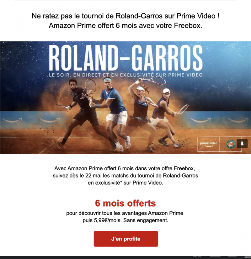 A l’heure où les joueurs commencent à fouler la terre battue des courts de Roland Garros, Free envoie un courriel à ses abonnés Freebox pour les informer qu’une partie du tournoi est accessible gratuitement directement sur Prime Video, à condition d’être abonné.