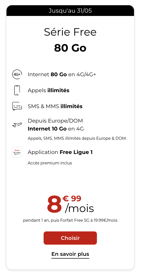 Jusqu’au 31 mai prochain, Free Mobile propose un nouvelle formule de son offre Série Free. Celle-ci comprend dorénavant 80 Go contre 90 Go précédemment à utiliser dans l’Hexagone. En revanche, le volume de données en roaming (Europe et DOM) passe de 8 à 10 Go. Affiché à 8,99€/mois, le prix ne change et reste plutôt agressif face à la concurrence. Au-delà de la première année, les abonnés basculeront automatiquement sur le forfait Free 5G 210 Go à 19.99€/mois. Le service Free Ligue 1 en accès premium est également inclus.