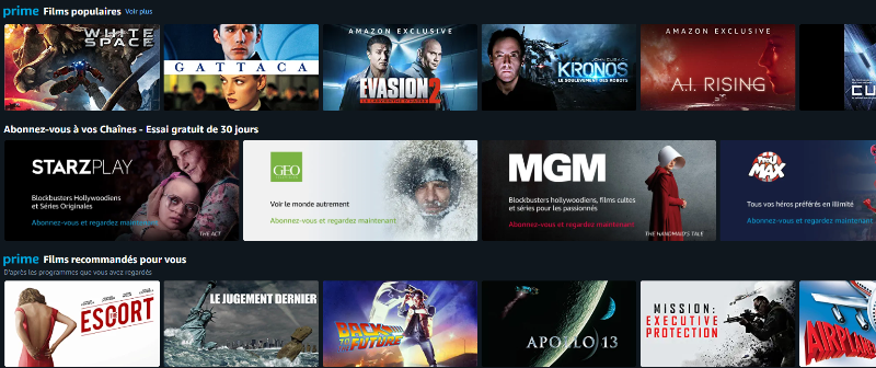 Les abonnés d’Amazon Prime peuvent aussi souscrire à des chaînes et services axées cinéma, séries, sciences, histoire et sports comme Crime District (1,99€), MGM 3,99€, Mubi (9,99€), Mon Science & Vie Junior (2,99€) , GEO Television (3,99€), Automoto (2,99€) ou encore Mezzo (3,5€), Hopster (4,99€).