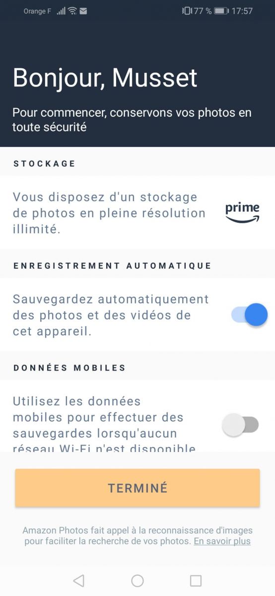 L’intérêt principal d’un stockage de cloud est l’accès à vos fichiers à tout moment. Pour optimiser cette utilisation, il est donc logique d’utiliser également l’application mobile gratuite. Une fois cette dernière téléchargée, il vous sera proposé de stocker toutes les images de votre smartphone directement sur Amazon Photos, vous pouvez bien sûr refuser et stocker uniquement une séléction d’images si vous préférez.